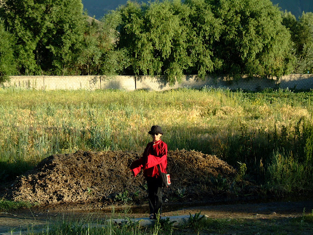 图为2001年7月6日传统上“冲拉亚岁”这一天,我与王力雄骑自行车去了冲拉村,见到村口的警车,贴在树上的禁令,而过去举行庆典之处,已被一圈垒起的土墙严密包围,不可能进去。那是夕阳时分,远远地望了一会儿土墙里那树木茂密的一片,佯装游客的我们留影、离去……