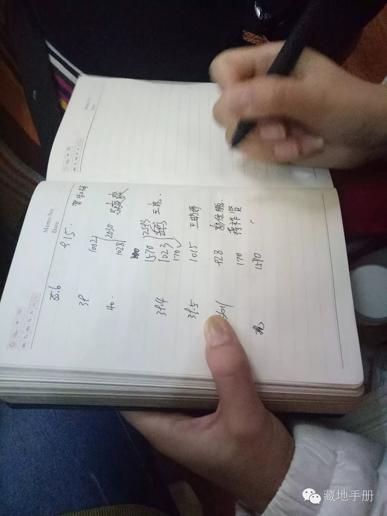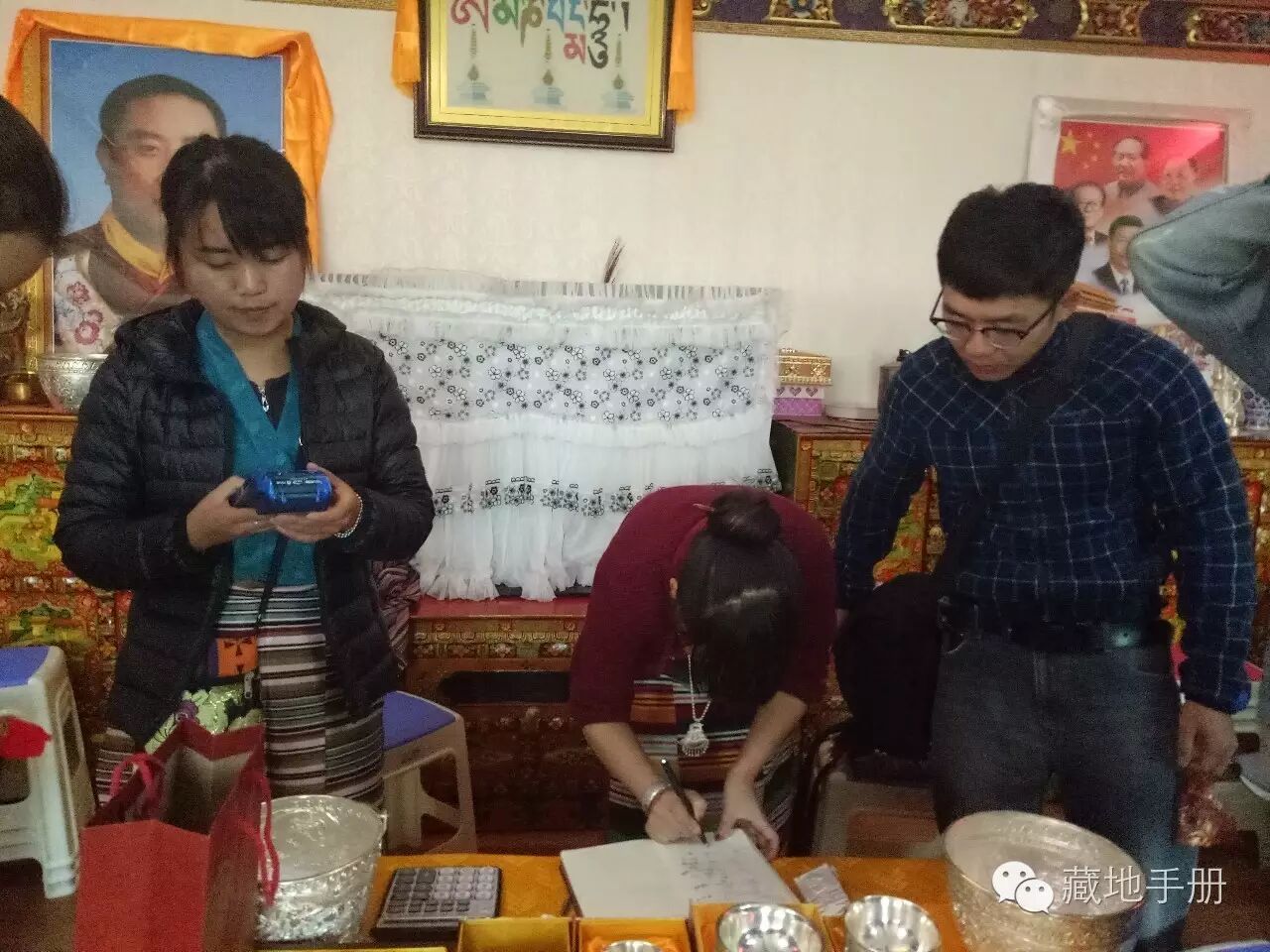 然后让游客围上来参观,央金在桌子上准备好了记账功德本,笔,pos机,游客们欣赏把玩起来,央金记账和刷卡,买的人很多。